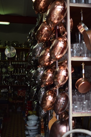A variety of copper and metal pans are neatly hung on a store rack, alongside shelves filled with glassware and ceramic bowls. The setting appears to be a kitchenware shop with dim lighting, emphasizing the reflective surfaces of the pots and pans.